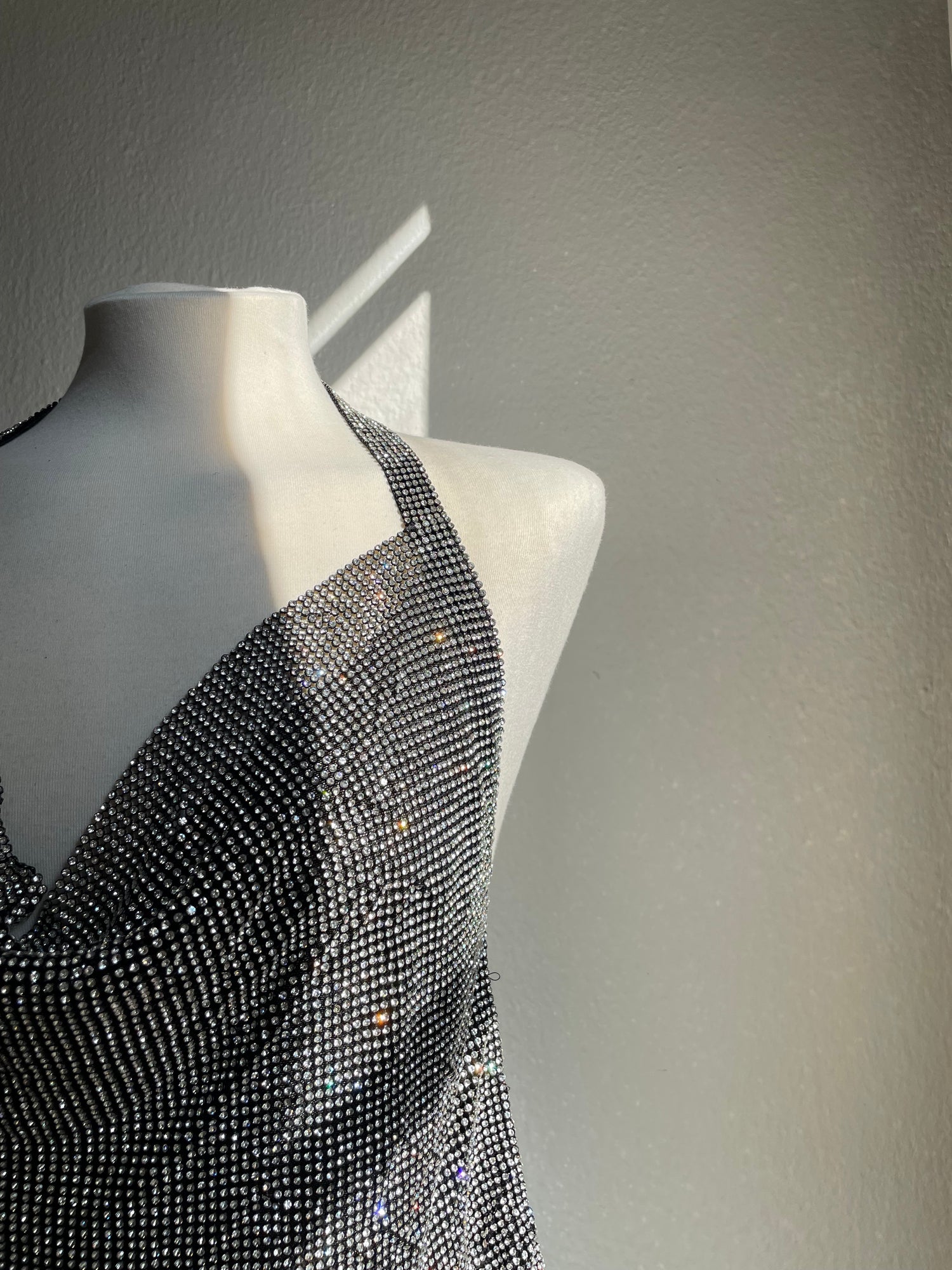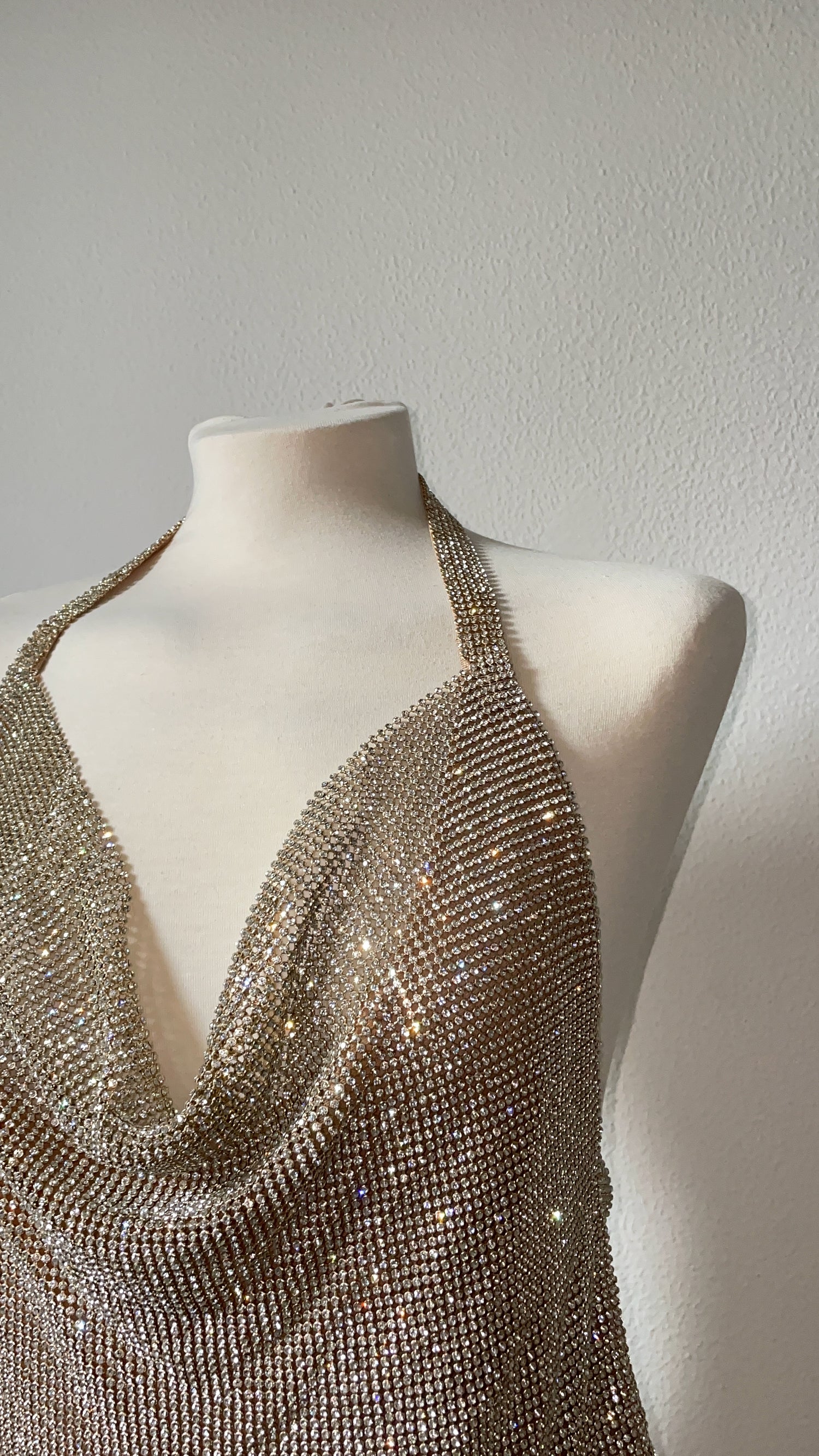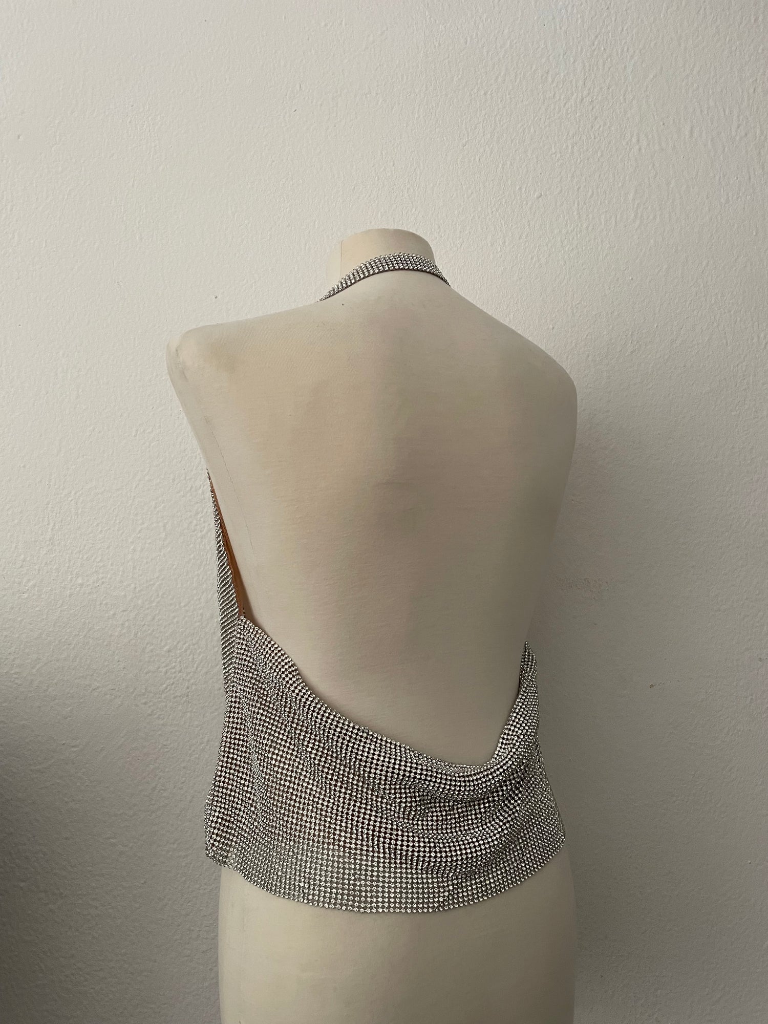 CARE INSTRUCTION: This chainmail top, made of metal and crystal mesh fabric, deserves special attention. We kindly suggest handling it with care to ensure its longevity. While wearing, we encourage our clients to be mindful of their movements. In the rare event of a mesh breakage, don't worry! Reach out to us, and we'll be delighted to offer repair services (additional cost may apply).