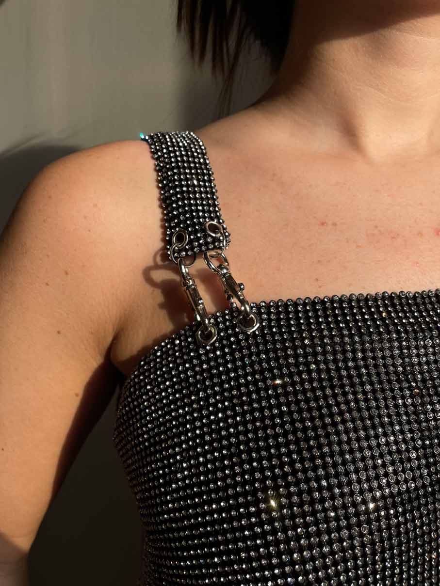 COMPOSITION: Material: crystal mesh. Inside: lycra. Aluminum chains.