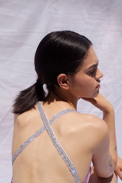 -DESCRIPTION: Crystal chainmail dress. Cowl neckline and crossed straps. Two available options: no lining (just the chainmail mesh) or with lining inside (a lycra mesh fabric hand sew inside). This version has crystal mesh straps to give it a bit of a sparkle to the metal mesh!